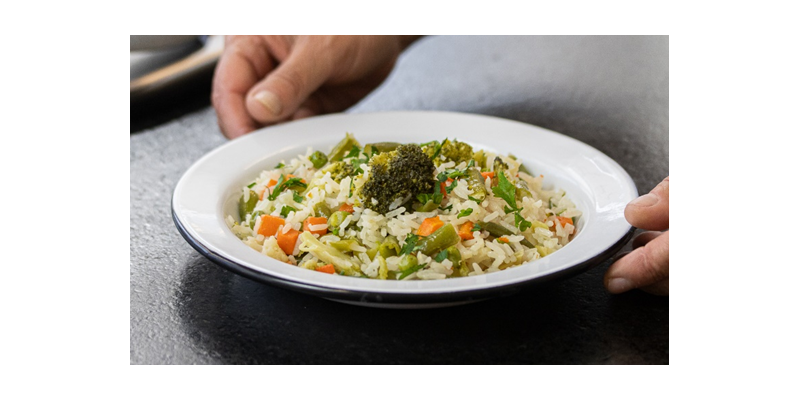 - Acrescente o arroz à panela e refogue por mais alguns minutos, mexendo constantemente