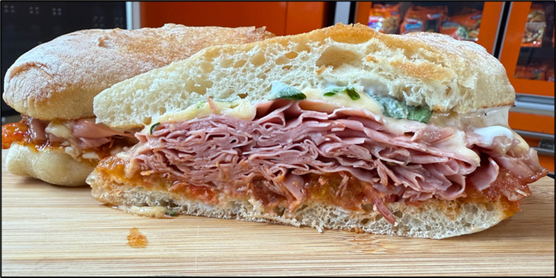 - Cortar o pão Ciabatta no sentido do comprimento, passar a doriana e aquecer no forno até ficar levemente dourado. Em uma frigideira, colocar as fatias de mortadela e o queijo muçarela, aquecer até dourar a mortadela e derreter o queijo. Passar o molho aioli na base do pão, colocar os tomates secos no comprimento do pão, colocar a mortadela com queijo muçarela, espalhar as folhas de manjericão e finalizar a coroa do pão com o molho aioli