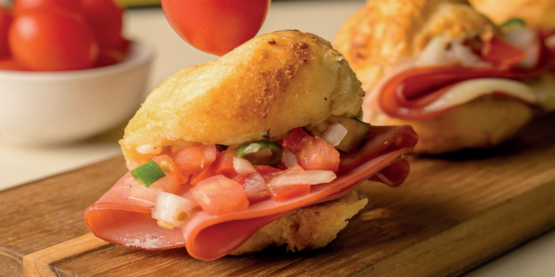 - Pão selado na Doriana, creme de queijo, Salame, fatias de provolone, Folhas de rúcula e finalizar com o vinagrete.