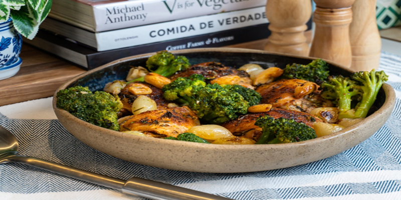 - Retire o alumínio e adicione os brócolis congelados diretamente sobre o frango.